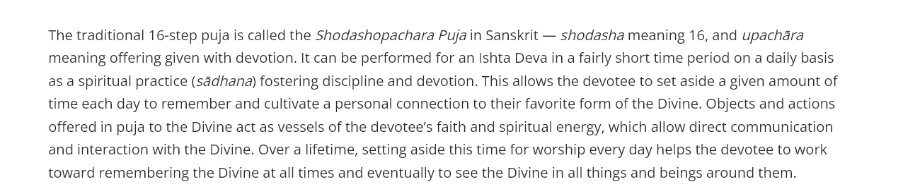 The Hindu American Foundation has a great article on how to conduct a traditional 16-step Hindu puja. Each of the 16 steps is defined in the article, and below is a snippet explaining the concept