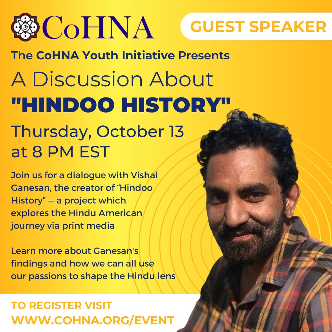 CoHNA is hosting an event with the sharp curator of Hindoo History, Vishal Ganesan. Registration available at this link.