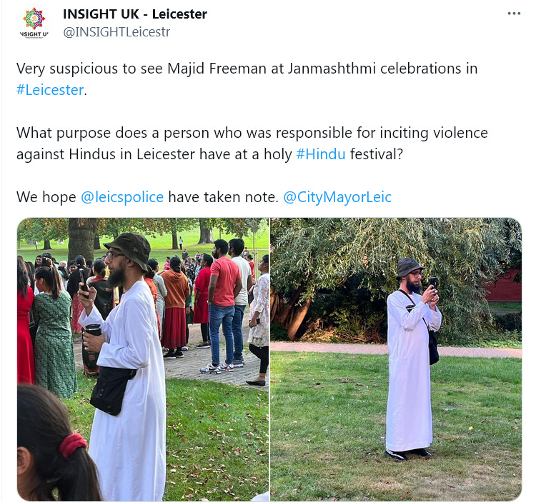 Many of our readers are likely familiar with the Hinduphobic attacks in Leicester and other parts of Britain by Muslim extremists in 2022. One of the key Muslim activists, Majid Freeman, recently was caught stalking Hindus during Janmashtami celebrations, alleging Hindu extremists were congregating (based on the presence of a Hanuman flag). Tweet shown below.