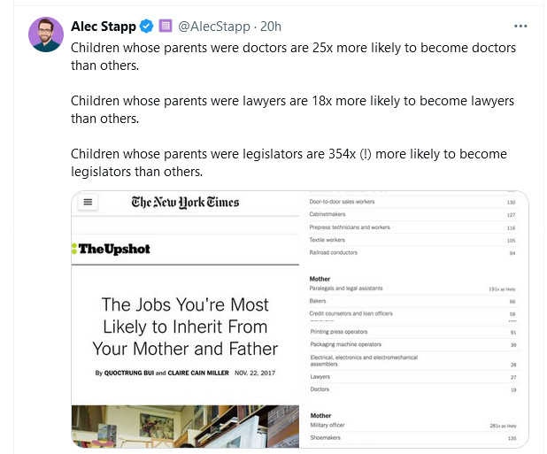 One might argue that university professors are brahmin equivalents in American society, and over half of the top university professors have parents who have a Ph.D. However its not just at the top of the social stack where assortative mating and children following in their parents footsteps is visible; its arguably more clear in the underclasses of America. Large swathes of urban black America experience intergenerational poverty, while much of white rural America is also following in that directions, both groups ravaged by drugs. So America has also reinvented dalits in a sense. Additionally, social mobility has declined considerably in America and income inequality is skyrocketing.