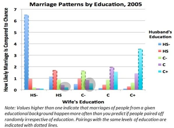 The reality is that varna is arguably more prevalent in America than in India. The National Bureau of Economic Research (NBER) defines assortative mating as “the process by which people of similar backgrounds, such as educational attainment or financial means, select a partner.” These statistics, from the Brookings Institute show that Americans largely engage in assortative mating across similar educational lines.