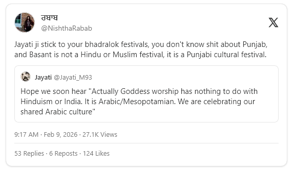 We’ve covered in some previous issues that there is a concerted effort and narrative to dehinduize festivals with Onam and Pongal being some of the more prominent examples, but even events like Diwali and even Durga Puja have not been spared. Pakistanis, leftists, and some Sikhs argued Basant is purely an ancient secular Punjabi festival and not Hindu in nature. Here we see a Punjabi ethnonationalist or possible Pakistani using a Bengali caste as a slur when confronted by a Bengali Hindu pointing out that Hindu festivals seem to always face people trying to strip the festival away from its Hindu roots.